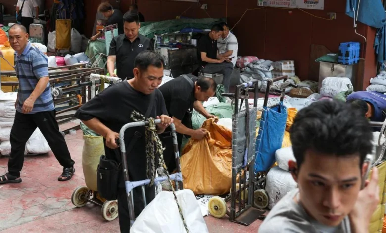 The images depict a microcosm of Guangzhou’s vast economic landscape, where countless businesses converge to facilitate the movement of goods, primarily textiles and apparel, across domestic and international markets. In one frame, workers meticulously arrange merchandise in a shoe shop, catering to a steady stream of buyers. Elsewhere, logistics personnel are seen navigating crowded pathways, expertly moving large sacks of clothing on handcarts, a testament to the efficient yet labor-intensive distribution network that underpins this sector. This constant flow of goods and people highlights the market’s dynamic nature, a place where transactions happen at a rapid pace, fueling countless supply chains.