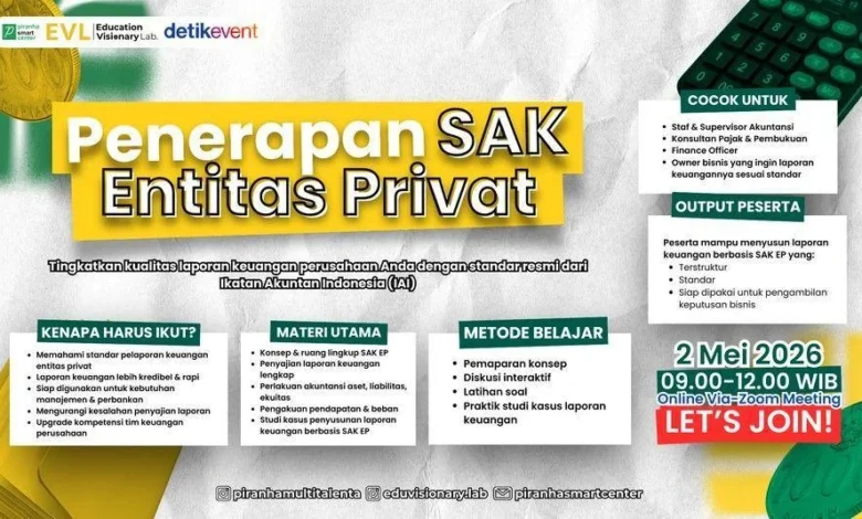 Jakarta, Indonesia – In an increasingly complex and regulated business environment, the demand for precise, transparent, and credible financial reporting has never been more critical, especially for private entities navigating the intricacies of growth and capital acquisition. Recognizing this pressing need, Education Visionary Lab (EVL) and Piranha Smart Center are poised to host the second batch of their highly anticipated webinar, "Application of Private Entity Financial Accounting Standards (SAK EP) – Batch 2." Scheduled for Saturday, May 2, 2026, from 09.00 to 12.00 WIB, this program is meticulously designed to empower accounting professionals, finance officers, consultants, and business owners with the essential knowledge and practical skills required to implement SAK EP effectively, thereby elevating the quality and trustworthiness of their financial statements.